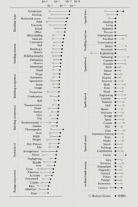 To further separate professional architectural terminology from everyday language, the authors then focused on identifying architectural terms that are especially important within the crowdsourced text. Although term frequency–inverse document frequency (TF–IDF) is a widely used measure of word importance in text mining, conventional TF–IDF-based methods are generally geared toward classifying or clustering words and tend to highlight relationships among similar terms rather than isolating strongly domain-specific words (Zhang et al., 2011). Consequently, an alternative approach was needed to determine whether a term in a document or corpus functions as a salient professional architectural feature.