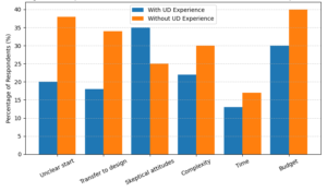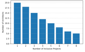 Notably, “skeptical attitudes of other stakeholders” was the only barrier reported more frequently by respondents who had UD experience. This is understandable because stakeholder resistance is not something that disappears simply through an architect’s own experience. Differences between the two groups were also less marked for the time and budget barriers than for several other barriers (Figure 3). Looking across all barriers together, respondents who had completed more inclusive projects (two or more) tended to report fewer barriers overall.