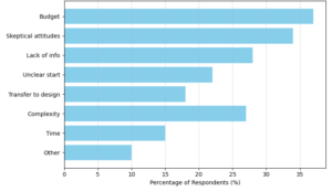 Budget (37%) and skeptical attitudes of other stakeholders (34%) were identified as the two most difficult barriers (Figure 2). In the open-ended answers, many architects described how limited understanding of UD among stakeholders created significant challenges. Clients and other actors—such as colleagues, urban planners, local authorities, and contractors—did not always grasp UD’s purpose or value. Several respondents noted that this made it harder to persuade stakeholders to include more inclusive features. Stakeholders’ tendency to think in narrow “target group” terms also appeared to prevent them from seeing how UD could raise overall design quality for everyone.