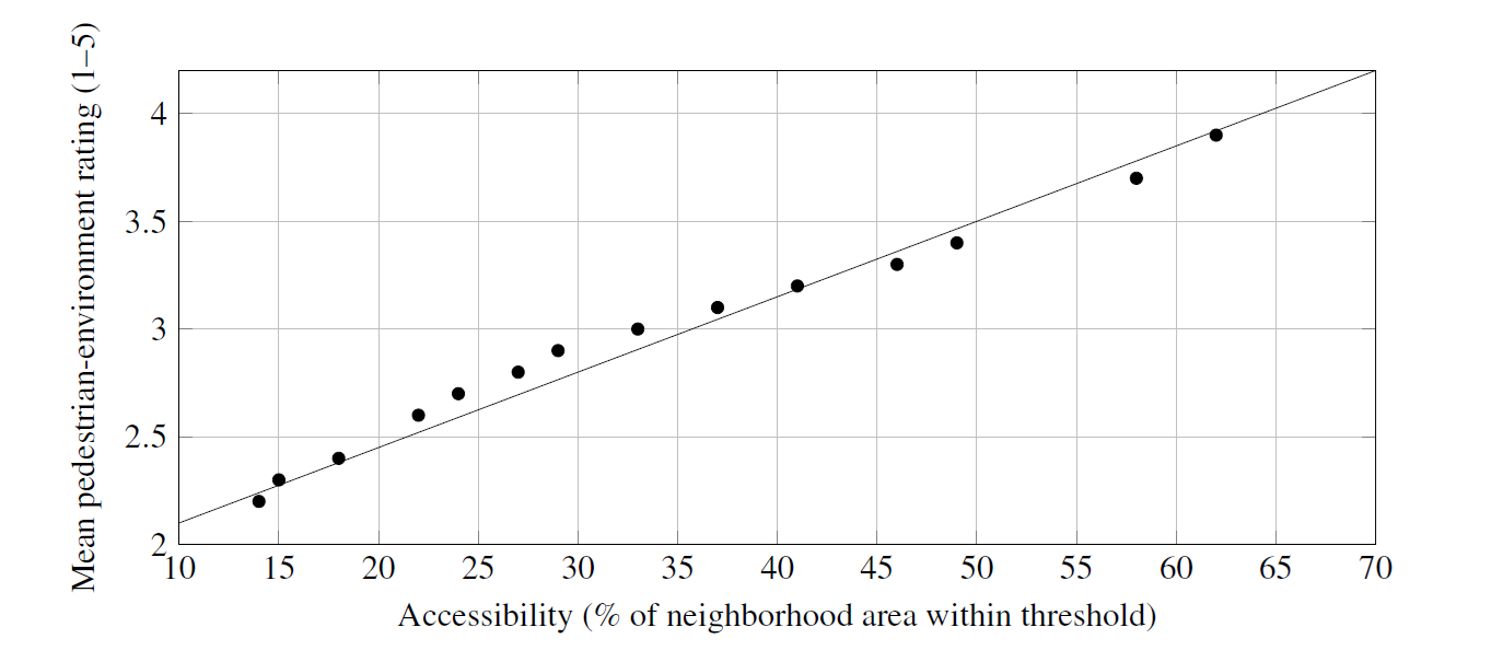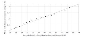Figure 3 illustrates the neighborhood-level relationship between accessibility and mean pedestrian-environment rating, showing a clear upward trend: neighborhoods with greater park/playground proximity tended to receive better pedestrian-environment evaluations.