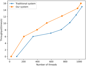 There are 500 million pieces of test data collected by terminals of three types of equipment. The access performance results are in Figure 11 and Figure 12. The horizontal axis in the figure indicates the number of threads, the vertical axis in Figure 13 indicates the throughput (times/second), and the vertical axis in Figure 14 indicates the delay time (milliseconds).