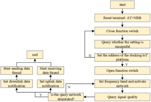 At present, the terminal controls the communication module through AT commands. Therefore, in addition to implementing application-specific business logic, the terminal needs a lightweight scheduler to manage serial communication, module state transitions, and message retransmission. A typical procedure is as follows: the module connects to the terminal, the serial port is configured, and the network access parameters (e.g., platform address) are provisioned. Signal detection is performed after enabling the module. In our tests, a signal strength above the recommended threshold indicates that the device can communicate reliably. The AT command AT+CGATT=1 is used to attach to the network; a returned OK indicates successful activation. Before bidirectional data exchange, the uplink and downlink notification functions are configured to avoid missing data reception or transmission.